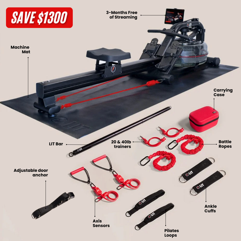 The LIT Strength Machine is the most versatile machine on the planet. An all-in-one water rower, pilates reformer, and strength trainer. The machine offers 500+ low impact exercises including rowing, cardio, barre, strength training, physical therapy, pilates, and more.